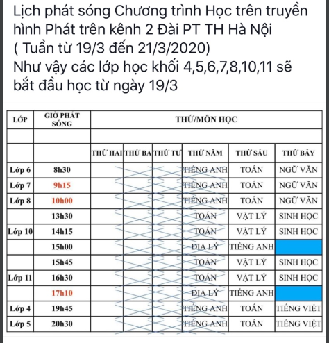 Thông báo về lịch học trên truyền hình của khối 6,7,8 từ 19/3/2020. Trân trọng gửi tới các vị PHHS và đề nghị các em học sinh nghiêm túc thực hiện.